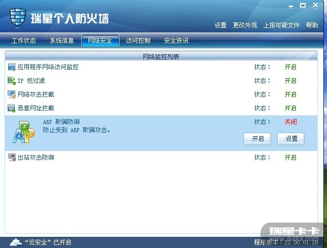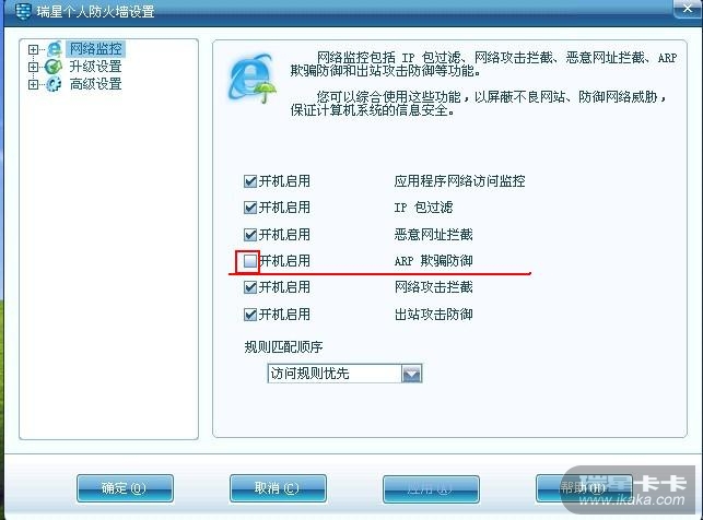 一般在使用路由器上网的情况下,建议打开瑞星防火墙的ARP欺骗防御。