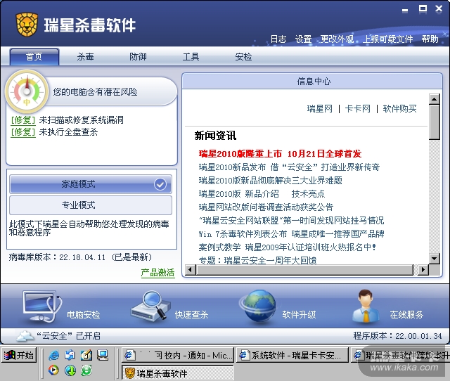 今天上午瑞星杀毒软件跨版本升级到2010版本了