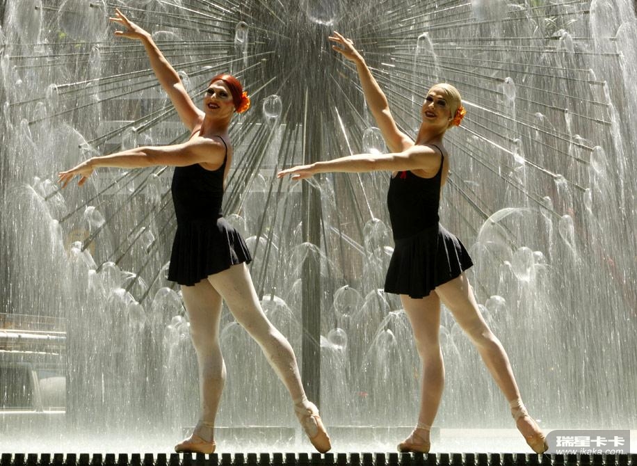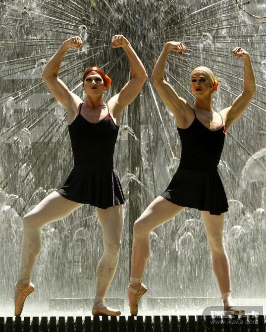 澳大利亚悉尼,来自纽约的全男班惹笑芭蕾舞团The Trocks在喷泉边起舞。高超的足尖技巧,优美的芭蕾舞姿,加上怪异的动作滑稽的表情,这些美国男子芭蕾演员们用一种另类的表现力颠覆了人们心中优雅高贵的印象,让观众欣赏传统以外的男扮女装芭蕾舞表演。
