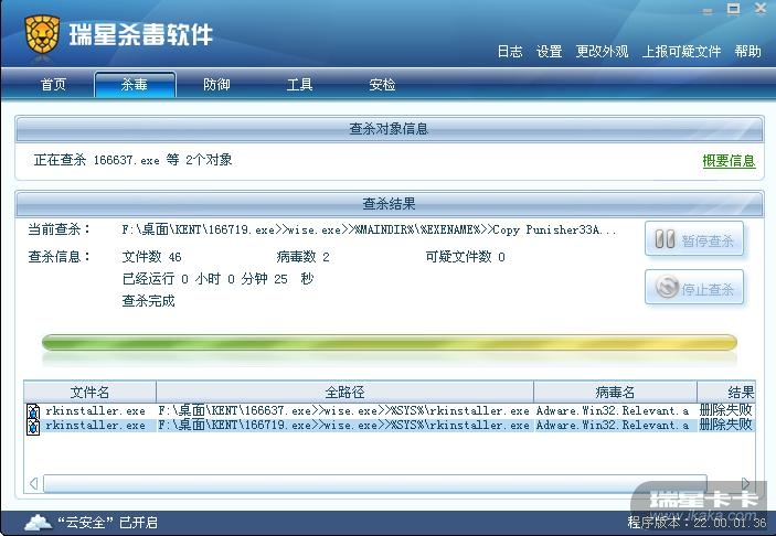 可能是病毒被系统进程调用中,建议重启动计算机 ,按F8键,进入系统安全模式下打开瑞星来杀毒。