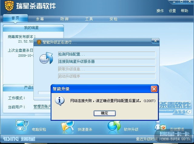 如题所说,我的电脑无法连接到瑞星网站上的任何页面,也没有办法在线升级,在线升级就提示我网络错误,让我检查网络设置,但是我的网络一直都是通的!