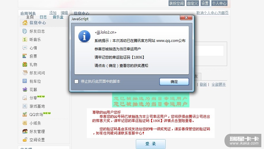 最近两天登陆QQ空间后在信息中心不能显示正常的空间信息。而是一个中奖提示。一看就知道是骗人的。但杀毒软件查不到任何病毒。我的杀毒软件是刚从瑞星2009升级到瑞星2010全功能版(6个月试用版)的。QQ游戏登陆后是变成一个97wan.com的网站的广告。很黄很暴力。这是网页脚本病毒还是什么原因。现在玩空间也很不方便。