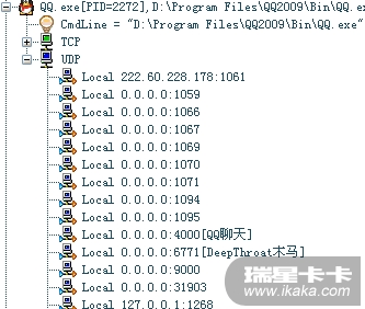 2.很奇怪的事,我不用网的时候,发现网络流量一直在增加,后来通过瑞星防火墙发现,是其中一个QQ在活动(我有两个QQ号,同时登陆),所以我就在瑞星防火墙的系统信息里发现那个活动QQ的TCP和UDP里发现里面有好多什么什么木马的提示,我的瑞星杀毒也没有报警.但我另一个QQ却没有这些木马提示.