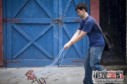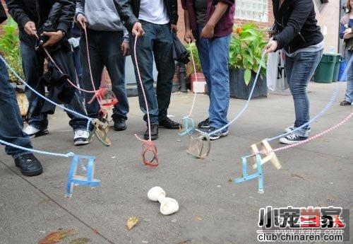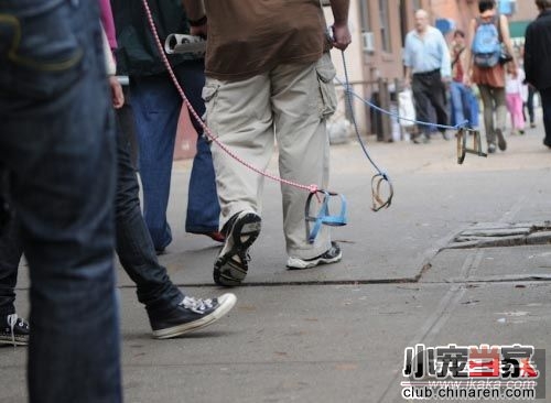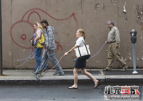 近日美国一知名网站举办超过一场2000人同时于布鲁克林街上遛狗的街头恶搞活动,他们号召一群演技逼真又敢玩的“疯子”,拿着1970年发明的“隐形狗玩具”,到街头演出。