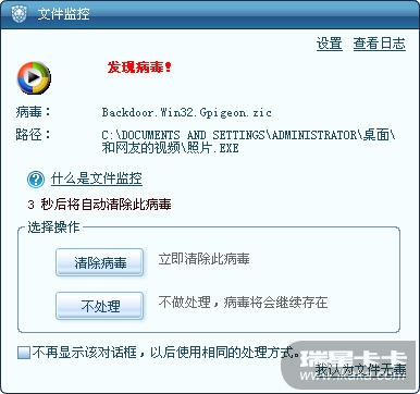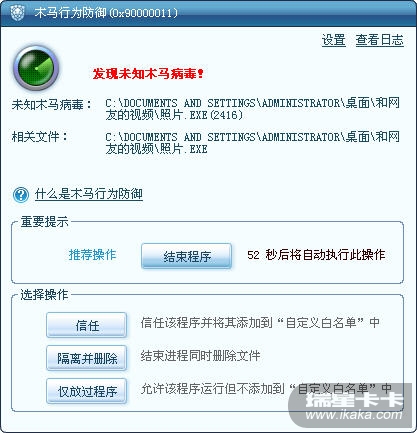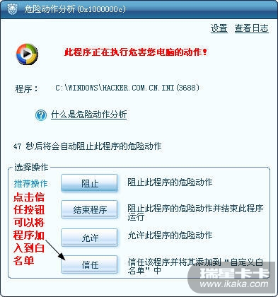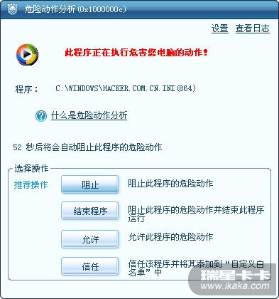 瑞星默认出厂设置是家庭模式,此时的木马行为防御以及危险动作分析提示框如下