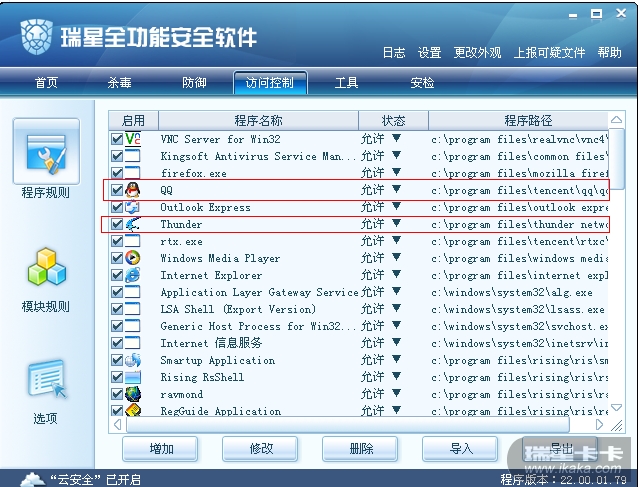 打开瑞星个人防火墙,在访问控制下的程序规则里,添加规则qq、迅雷程序并设置允许访问网络。