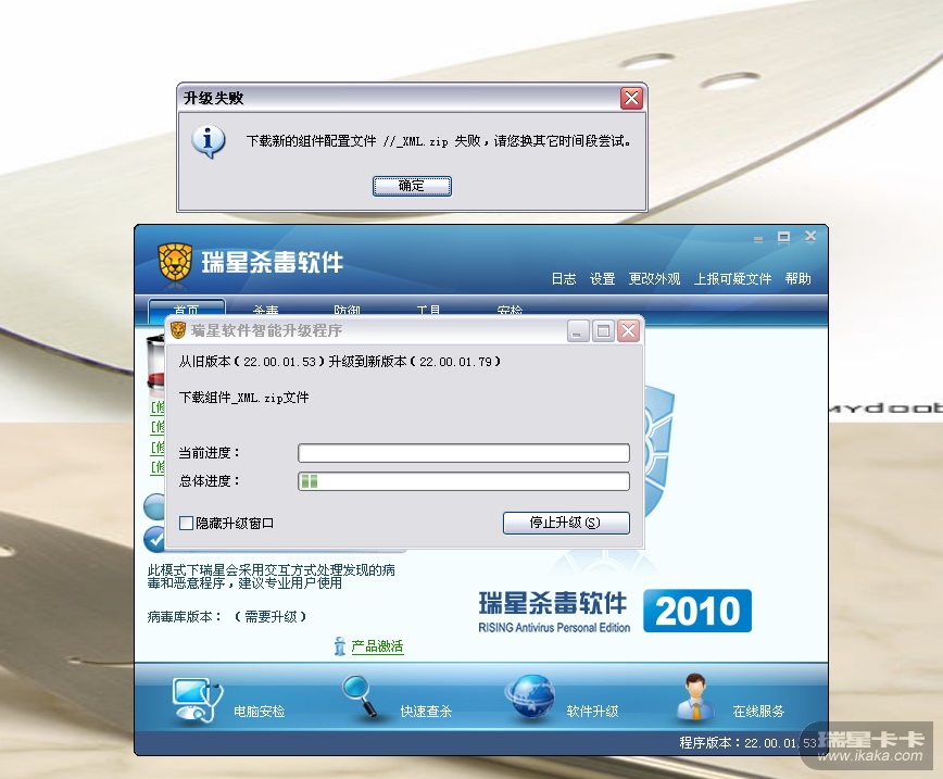 我的免费瑞星升级不了,试了很多次了,不知道出了什么问题 。前一个月升级是没有问题的