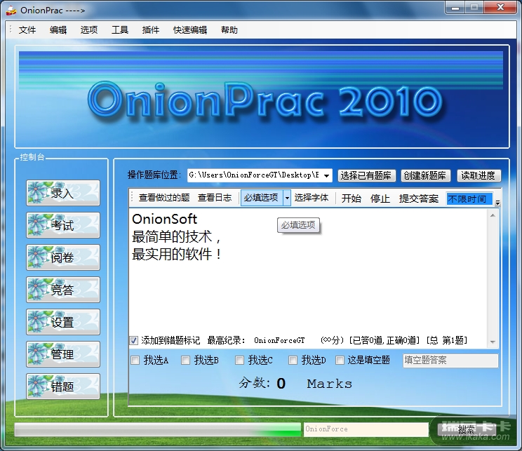 考试:按顺序答题,生成一份你的答案文件(*.stu),自动放到你的桌面上。