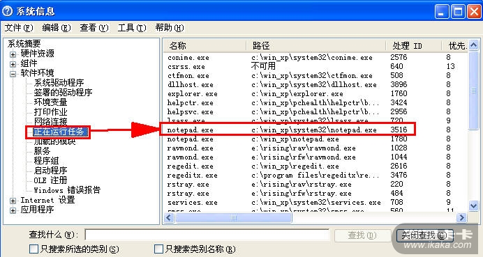 “开始”→“运行”→输入“msinfo32.exe”就可以显示很详细系统所有进程及它的详细路径等,参见图片所示: