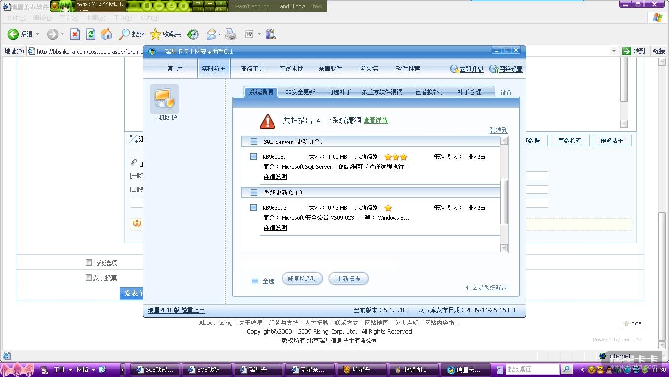 ,而且感觉防火墙一直在占用网络,用杀毒软件反复杀了几次,都没有发现有任何病毒,用卡卡扫描发现4个系统漏洞
