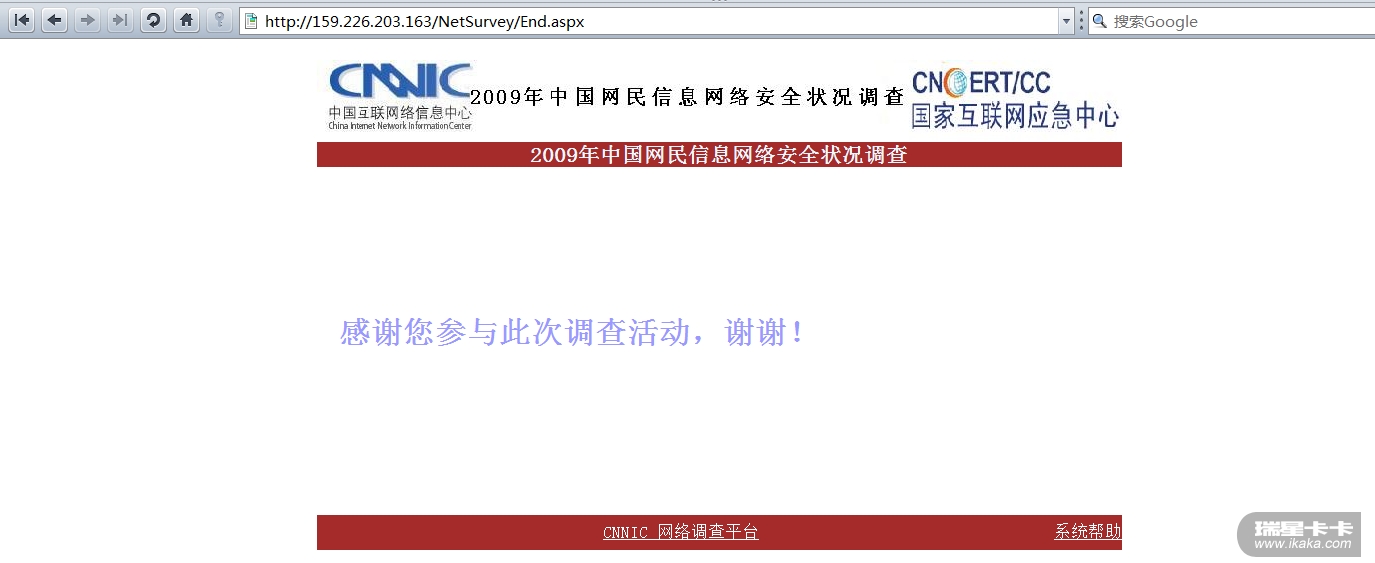 欢迎参加由中国互联网络信息中心(CNNIC)和国家互联网应急中心(CNCERT)举办2009年中国网民信息网络安全状况调查活动。 本次活动主要是调查互联网用户信息网络安全认识情况、防范意识、安全事件发生情况以及安全软件使用情况,同时希望通过调查活动提高用户安全意识。
