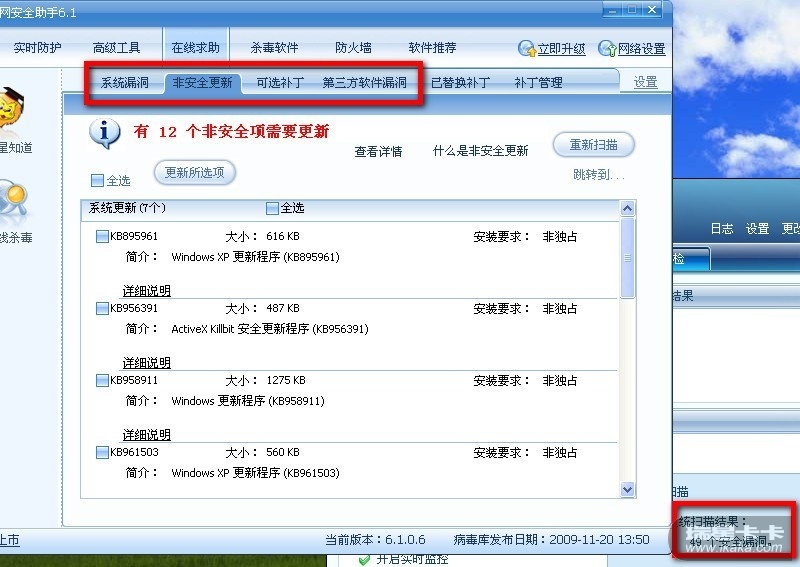 6.1版本的卡卡上网安全助手细化了漏洞分类,默认显示的是“系统漏洞”,之后还有“非安全更新”、“可选补丁”、“第三方软件漏洞”这三个项目,所以瑞星杀毒软件2010安检显示的结果为这四个项目合起来的结果,如下图所例,非安全更新还有12个漏洞,可选补丁是0,第三方软件漏洞也是0,所以就是37+12+0+0=49