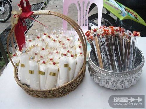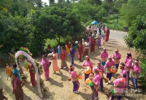婚礼仪式开始前,新郎身着华丽的礼服,在众位打扮得花枝招展得少女簇拥下,由长鼓开道,浩浩荡荡来到村中长老选定的大树前。少女们将彩礼陈列在“新娘树”前,长老宣布婚礼开始。这时,新郎会拿出一打蜡烛,逐个点燃,一一插在龛玛旁边,然后倾听长老朗诵经文的有关章节。