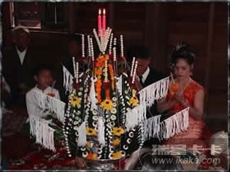 接着,新郎的父亲将一些鲜花、槟榔和几枚银元放在龛玛的枕头里,村中最为年长的老夫人代表“新娘树”接受礼物,蜡烛熄灭时,婚礼仪式结束。人们开始向新郎祝福,并一道进餐,之后一起欢歌舞蹈,直到夜幕降临。