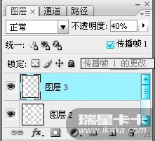 12、回到第一个帧,在图层面板那,把"传播帧1"前的勾选上,然后把3个图层的"不透明度"都调低点
