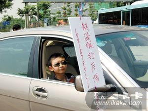 昨日下午2时许,这名戴着墨镜的小男孩,一脸稚气地坐在一辆崭新的宝马车副驾驶座上,从车窗里伸出一个用撑衣架做的钓竿,吊着一块白色泡沫板,上面写着“缺温暖,钓后妈”六个鲜红的大字,并留下了手机号。而泡沫板下端则吊着一根魔术荧光棒做成的“鱼饵”。每当小男孩见到有好奇的市民停下来观看时就显得特别兴奋,不停晃动“鱼杆”,并把告示举得高高的。
