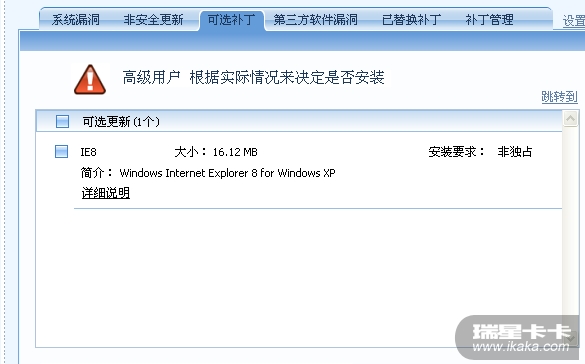 我的系统用的是IE6 卡卡检测到可选IE8补丁 请问这个补丁如何能忽略掉 :kaka1: