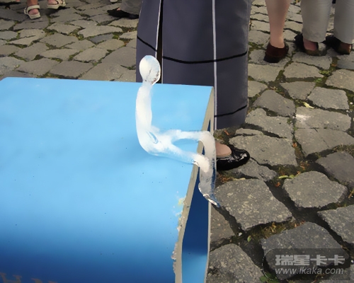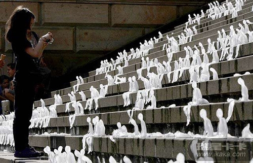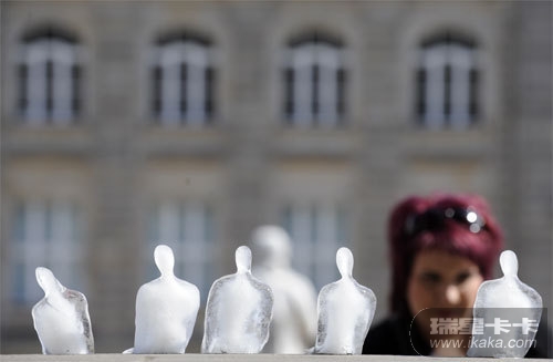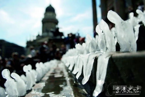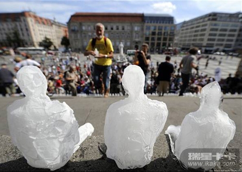之后我才知道,其实创作者Nele Azevedo的本意不是让人感叹人生易逝,而是呼吁人们关注“全球变暖·冰雪融化”问题。自2005年开始,这位来自巴西的艺术家就在全球各地举办这个名为“Melting Men(融化的人)”的展览。其中影响比较大的一次,是2009年9月2日在柏林宪兵广场音乐厅的台阶上展出的1000个“Melting Men”。(以下图片似乎都是来自这次展览。)