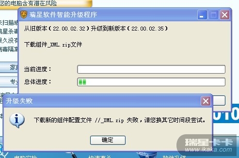 估计是楼主电脑的系统有问题吧,我的瑞星升级很正常!建议重新再升级一下试试?实在不行的话,就用添加/删除组件修复一下瑞星。然后再升级!以上都不行,建议楼主与客服联系。:kaka12: