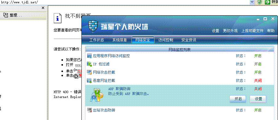在防火墙开启状态,只有将防火墙“恶意网址拦截”、“ARP欺骗防御”关闭后,才能登陆