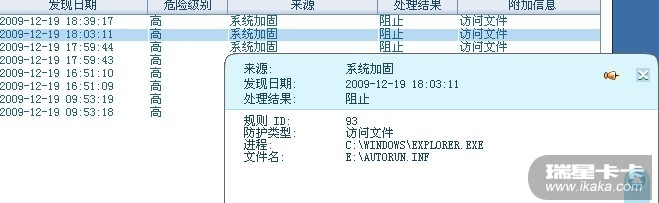 就算没有autorun.inf文件,系统自身的桌面进程也是会执行访问autorun.inf文件的命令的,2010瑞星的主动防御会常规性的阻止其访问autorun.inf文件的企图,并记录日志,哪怕没那autorun.inf文件,也一样阻止一次并记录日志。