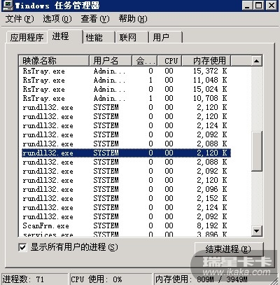 服务器重有一个进程 rundll32.exe 运行几天后总进程个数最多可达180左右,今天还算比较少的了 只有71个。