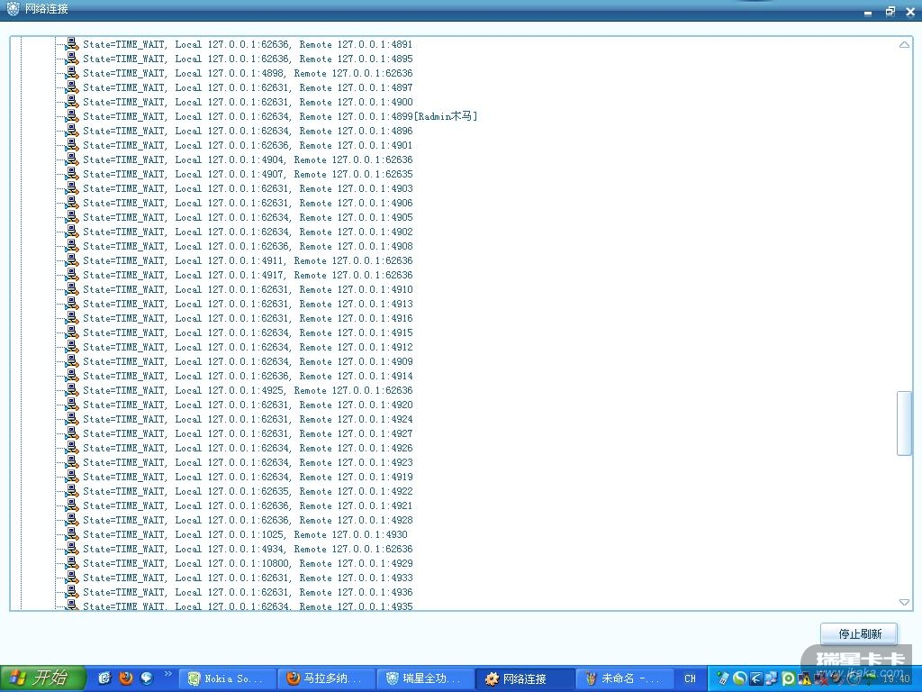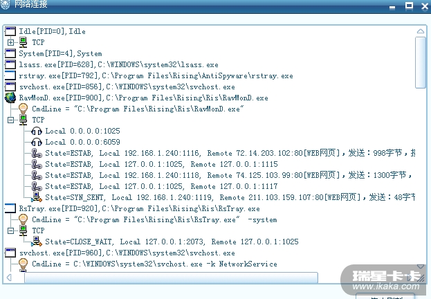楼主可以结合瑞星工具下面的网络连接观察那个进程在接受和发送数据。