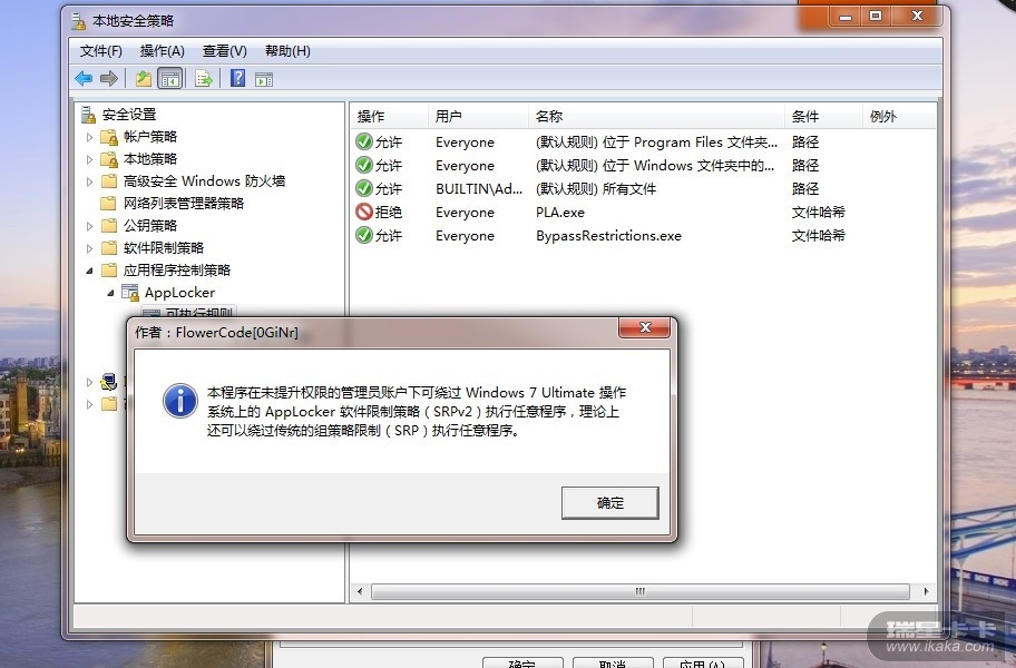 此程序在未提升权限的管理员账户下可绕过 Windows 7 Ultimate 操作系统上的 AppLocker 软件限制策略(SRPv2)执行任意程序,