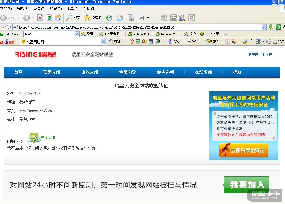 求助,已经加入瑞星云,显示安全认证,怎么瑞星还报毒 site.ikaka也显示毒挂马