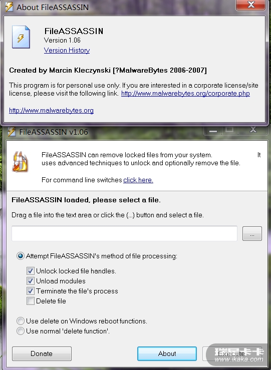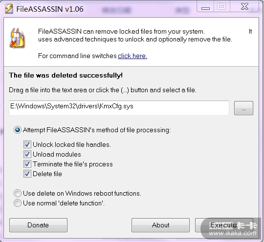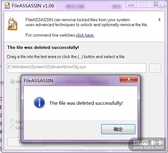http://www.malwarebytes.org/fileassassin.php为了考验它的删除文件的能力,我选择拿CA HIPS 的驱动开刀。用 fileassassin删除它的驱动KmxCfg.sys :