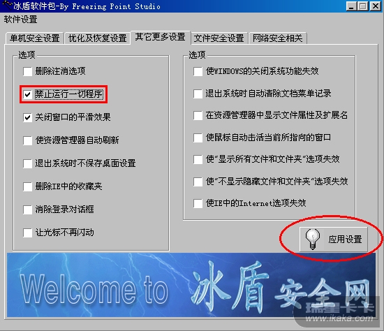 如网友所言,当我选择了“禁止运行一切程序”(图二),并关闭冰盾软件后,操作立即生效,很多文件都无法打开了,均出现图一的限制提示框。