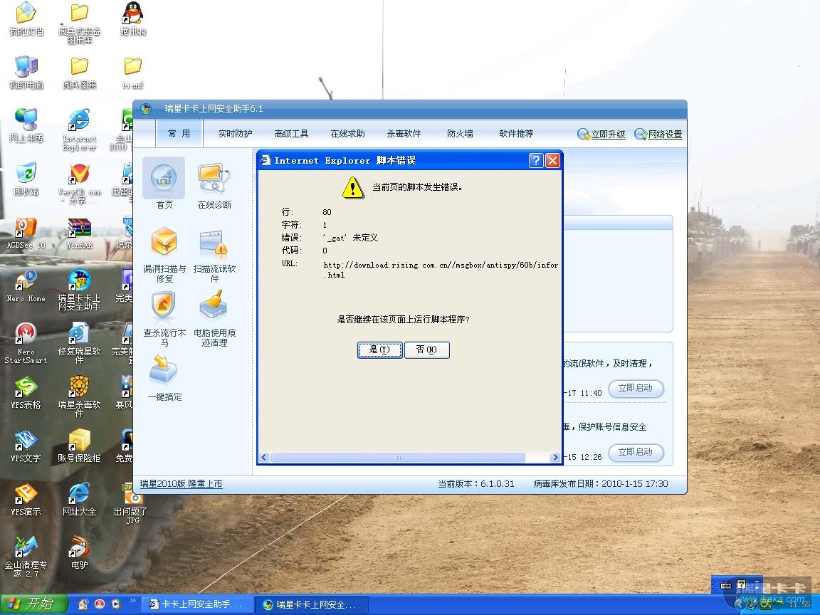 RT,刚才开机升级卡卡时,突然弹出个对话框,提示当前脚本出现错误,行:13;字符:210;错误:缺少'}',见附件。不知何故,所以点了否,结果又弹出一提示当前脚本出现错误的对话框:行:80;字符:1;错误:'_gat'未定义然后再点否,对话框就没有了。卡卡助手可以照常升级,貌似都正常。但我反复试了几次,每回重新打开卡卡都会弹出这个对话框。这个现象今早才出现,以前没有。我的卡卡是6.1.0.31,病毒库是2010-1-15 17:30的最新版。求助版主和大侠们指教,是不是需要重装卡卡?还是要用瑞星杀毒(上周杀过毒的)