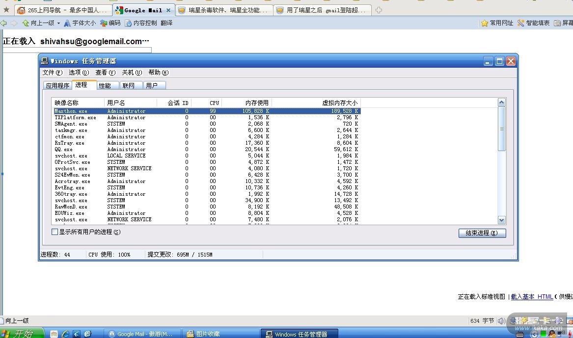 用了瑞星之后 gmail登陆超慢。cpu占用率100%,请问各位大大是怎么回事啊?