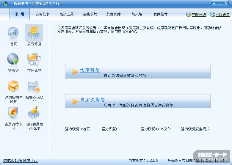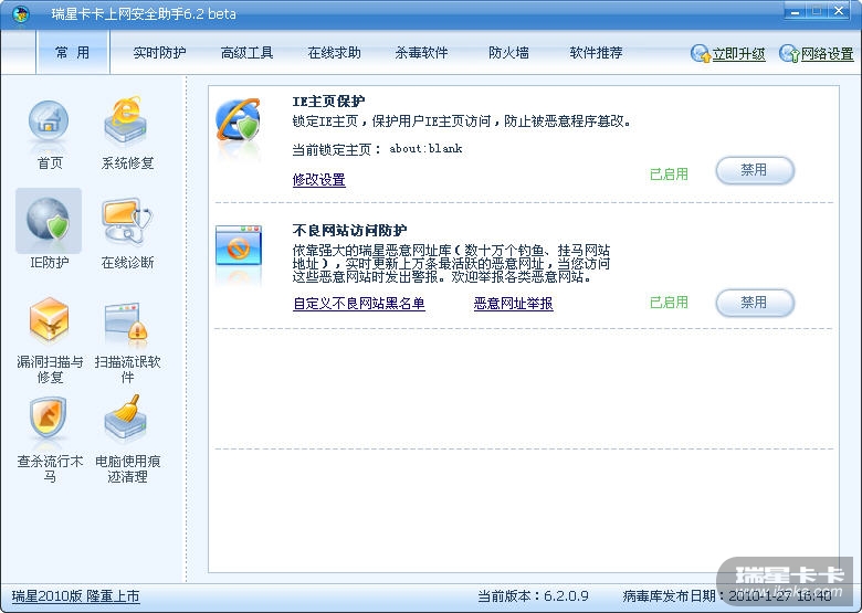 建议有经验的用户将行为防御调整至高级以获得更全面的保护!另外瑞星卡卡安全助手6.2beta版本新增IE首页保护和经过改进的全新系统修复功能可以锁定主页并修复各种手段恶意篡改的IE首页,欢迎试用。下载地址:http://download.rising.com.cn/for_down/kakatool/kakasetupv6_beta.exe