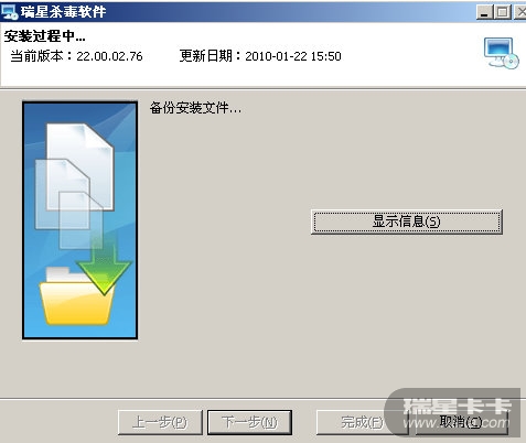 我从官网下载瑞星2010,在安装到备份安装文件页面时,页面就不动了,等了很长时间都不行,我试了好几次都是这种情况,我的系统是XP:kaka4: