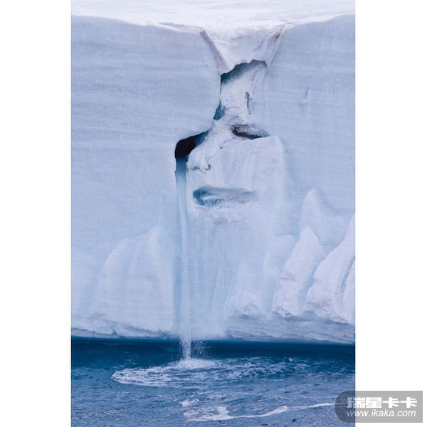 挪威北极地区冰川融化的照片,照片中融化的冰壁内出现了一张可怕的脸,融水成为这张令人恐怖的脸留下的伤心泪