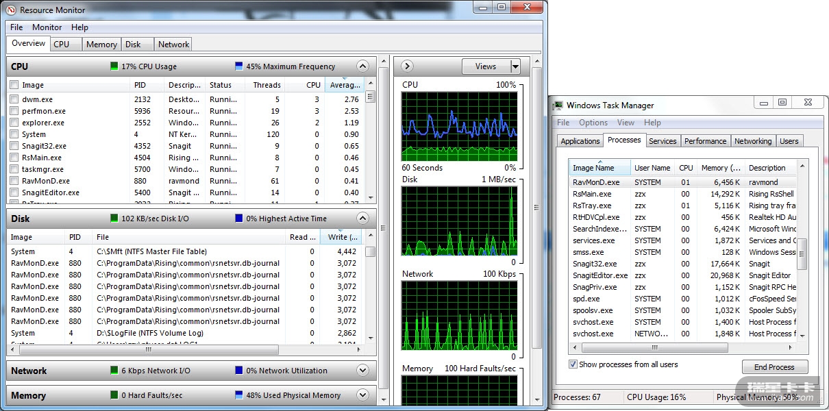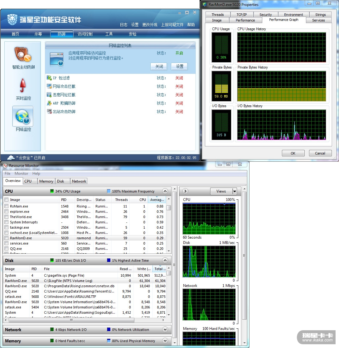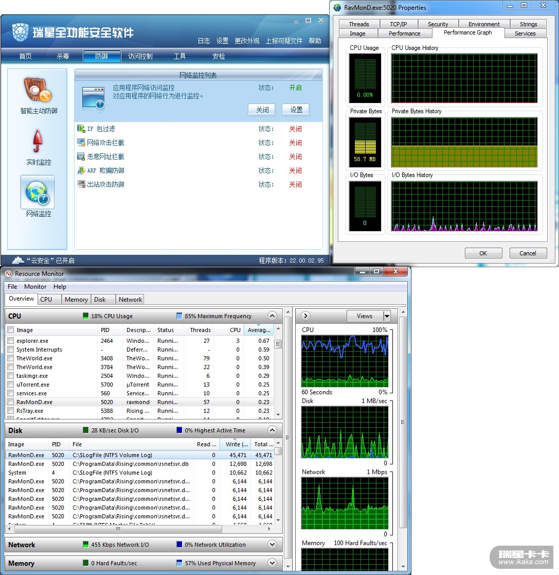 请大家提供瑞星防火墙版本号,任务管理器中的ravmond.exe截图,以及当时在做哪些操作。