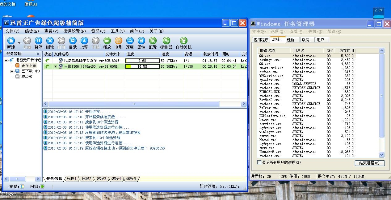 当前瑞星22.33.04.04,winxp sp2,迅雷5.8.5.593,我发现迅雷只开1个下载任务时,CPU占用小于70,开2个任务就完完