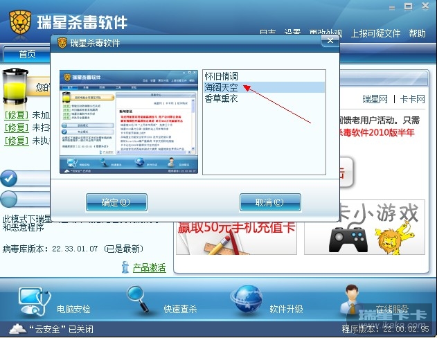 弱弱的问一下,原来用2009时不是有那个叫“绚丽极光”的皮肤吗?升级2010很久了,怎么没发现这款皮肤,是不是没有啊,我用的是个人版的杀毒软件和防火墙。