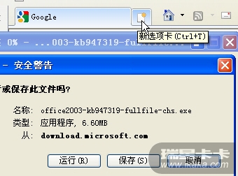 另外,如果先行打开一IE8窗口再点卡卡漏洞扫描中的“补丁链接”就会在该IE8窗口中的新选项卡中弹出正常下载对话框,窗口也不会关闭。如图: