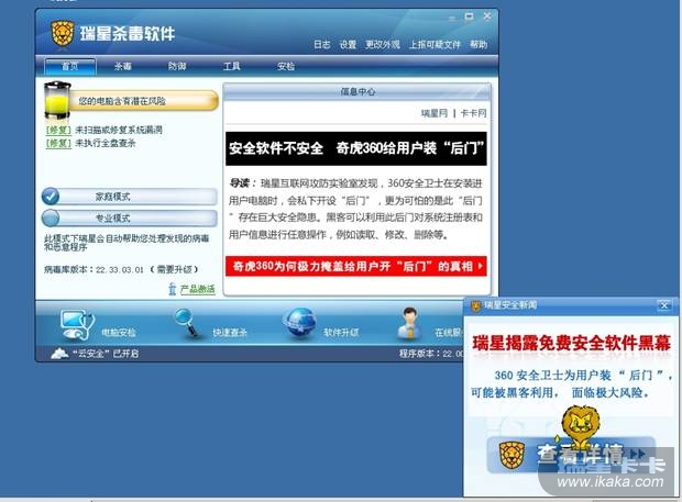 我用了瑞星一年多了,感觉还可以,但是最近天天开机就会看到瑞星的主页面上大范围的打击360安全卫士,哎,也不能这样哦,我是瑞星+安全卫士,感觉这样的组合不错哦,你说瑞星打击360到底是为了什么