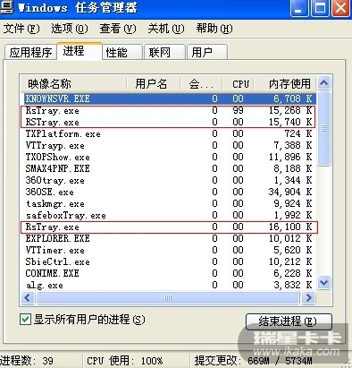 如图一,进程里有1个RSTray(卡卡),2个RsTray(RAV和RFW)