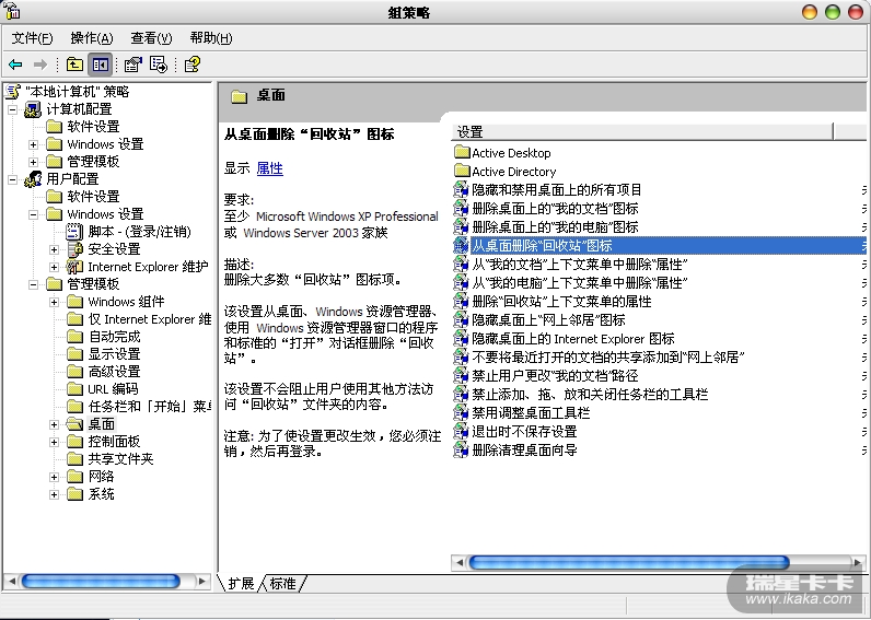 开始->运行,输入gpedit.msc。在出现的对话框中选择用户配置->管理模块->桌面,找到从桌面删除"回收站"图标,如下图:
