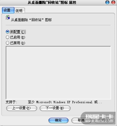 选择未配置后应用、确定,关闭对话框后刷新桌面就可以看到回收站了