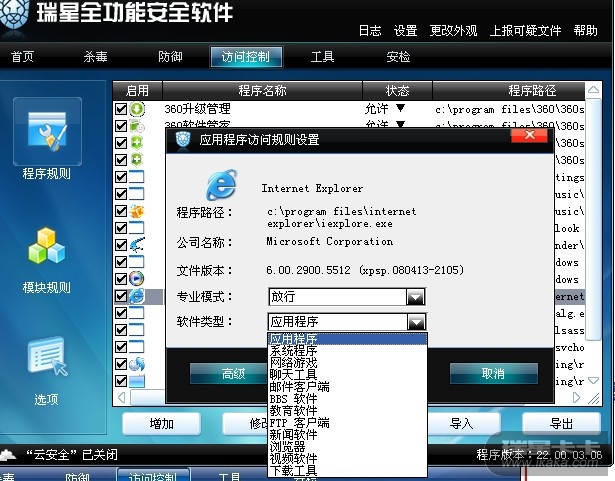 该设置中的“允许上网的程序分类”的确定需要在『应用程序访问控制』中手动设置,目前还不支持自动识别,默认都是“应用程序”,可以根据自己的需要更改该程序的程序类型。