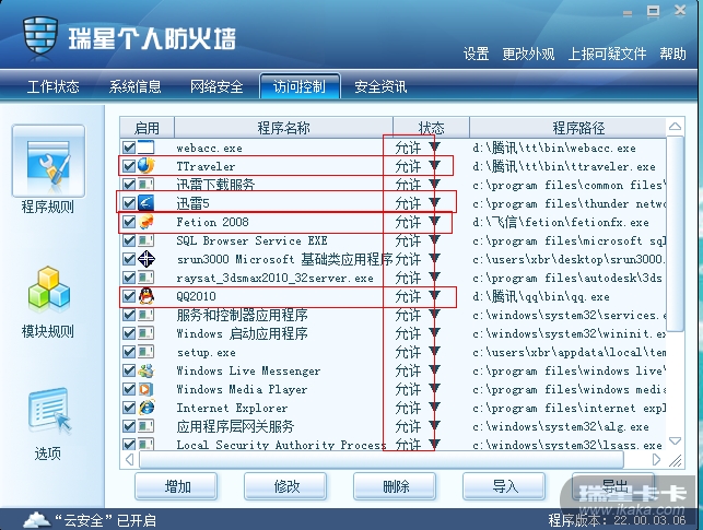 我是选中的,程序是被瑞星信任的,也被放行了。但是不断弹出已放行,QQ,搜狗拼音,飞信,迅雷都是如此,发一条信息弹出好几次。