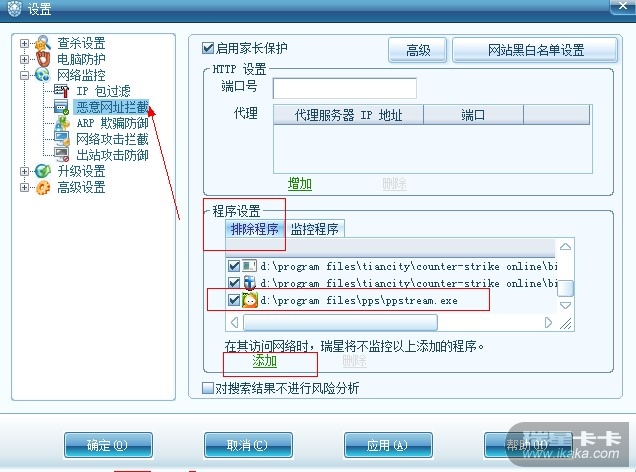 打开瑞星设置,网络监控,恶意网址拦截,排除程序,添加,将下载工具、网络电视等大流量传送程序加入,确定。