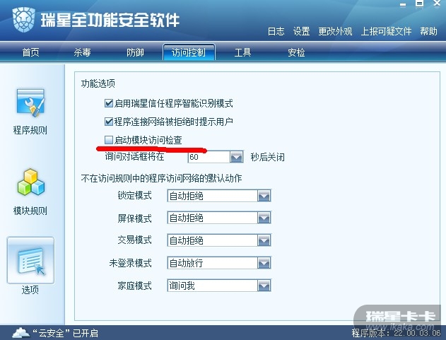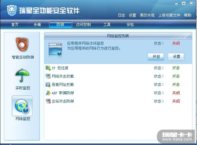 打开瑞星设置,电脑防护,木马行为防御,行为防御白名单,将下载工具、网络电视等大流量传送程序加入,确定