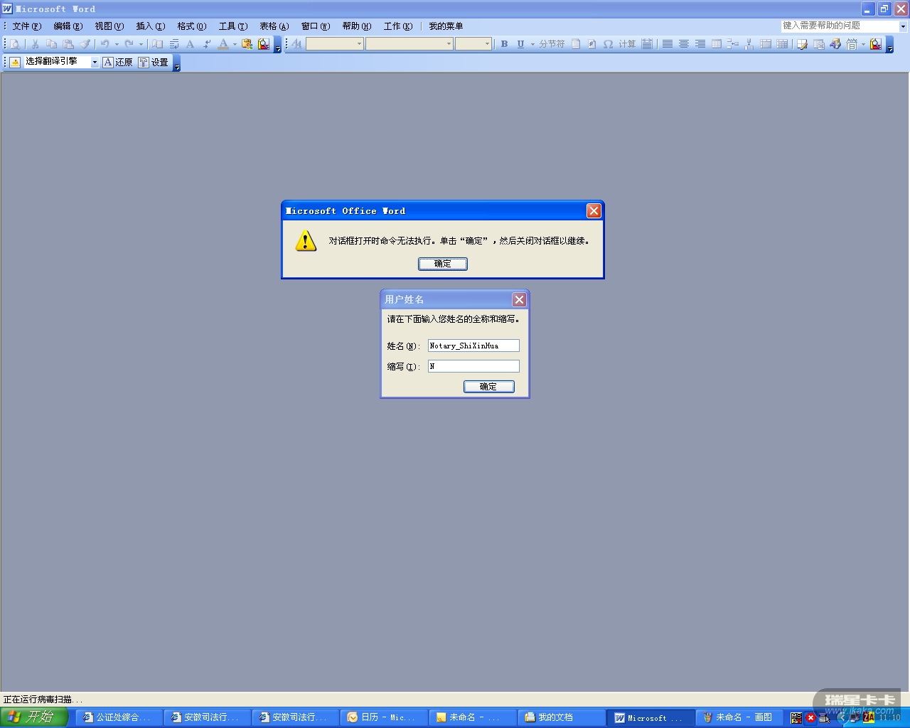 我单位用了瑞星企业版,安装后,发现与WORD2003有冲突,每次打开word,都会弹出两个对话框,一个是对话框打开时命令无法执行,单击确定,然后关闭对话框以继续,第二个是请在下面输入您姓名的全称和缩写。查询一下,网上说是瑞星的嵌入式杀毒与word2003之间有问题,用了一些方法,无法解决这个问题。为此,单位同事觉得挺烦,领导要求必须解决。请工程师看看有什么好的解决办法。
