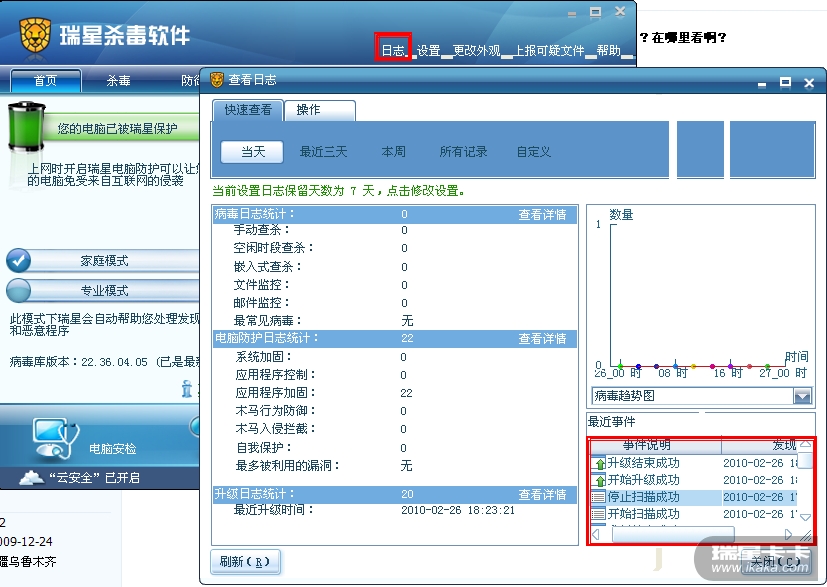 在瑞星杀软的 设置 旁边的 日志 里看“最近事件”,记录详细!